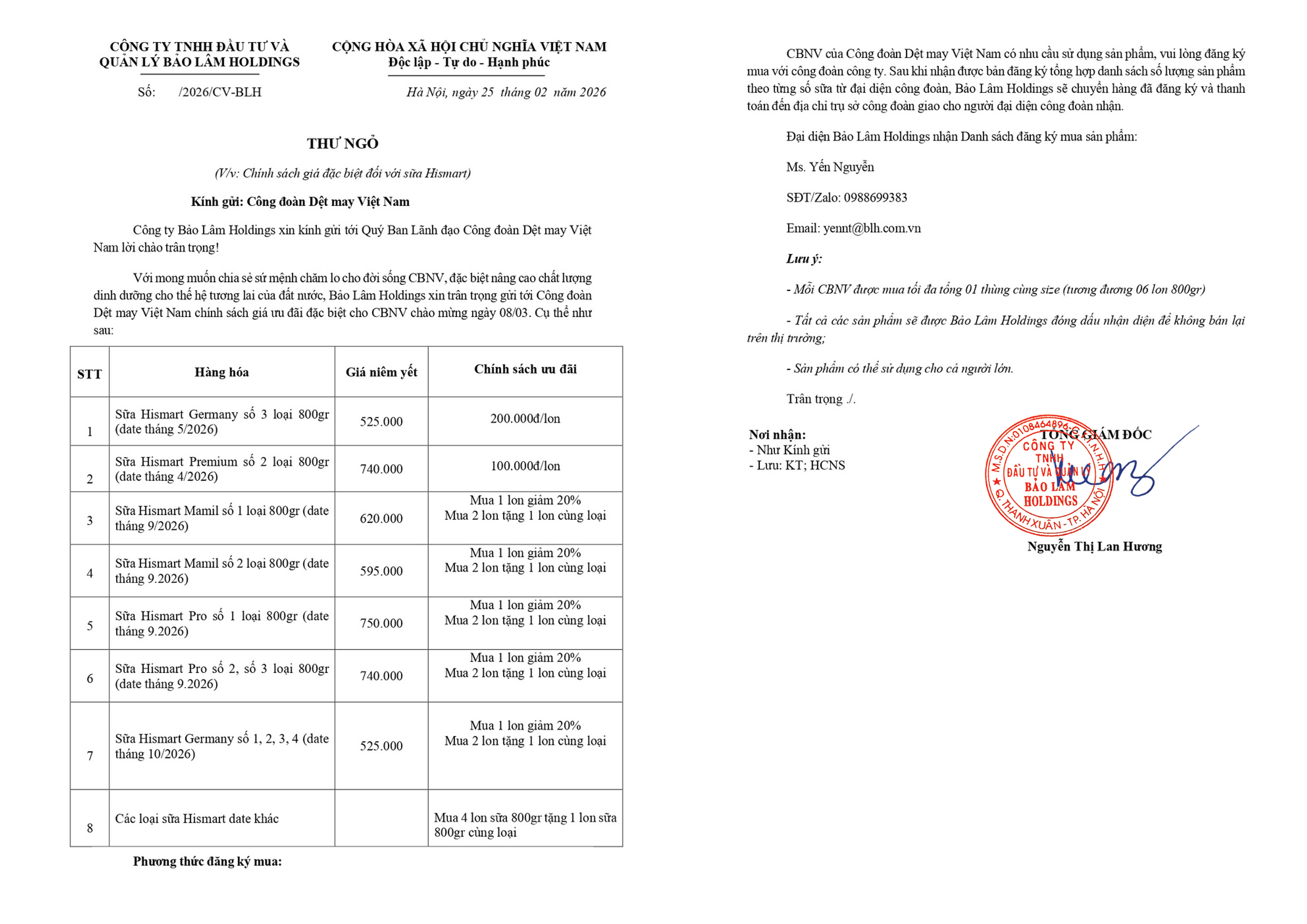 Thực hiện Chương trình phúc lợi đoàn viên đã ký kết, nhân Ngày Quốc tế Phụ nữ (8/3), Công ty TNHH Đầu tư & Quản lý Bảo Lâm HOLDINGS triển khai chính sách bán hàng ưu đãi...